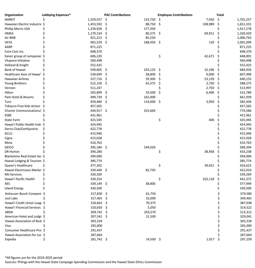 The Deep Blue State's study, which we named the 2025 Hawaii Juice Politics Top 50 looked at more than 100,000 campaign contributions linked to hundreds of corporate and individual donors along with more than 8,200 lobbyist expenditure reports filed by those same companies.